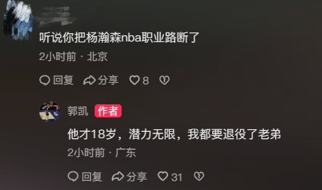 郭凯发抖音庆祝球队进入八强,有一位网友评论道:“听说你把杨瀚森NBA职业路给断了。”