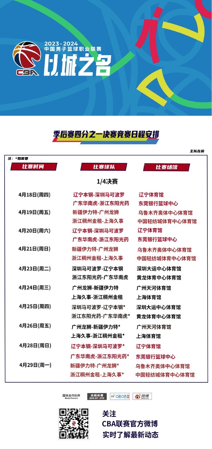 4月16日讯 随着上海男篮淘汰北京男篮,CBA本赛季季后赛8强全部出炉。8强出炉后,CBA官方随即公布了1/4决赛的赛程。