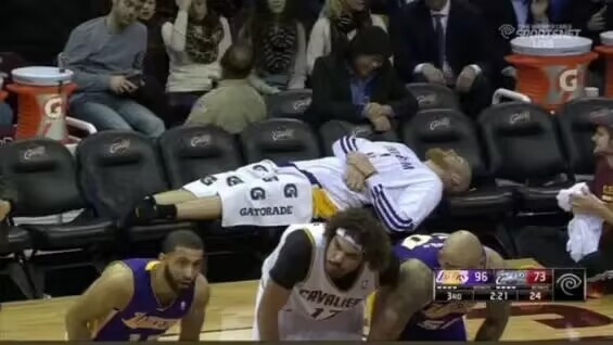 当年湖人对阵骑士的比赛,湖人多人犯满离场,卡曼平躺在替补席上。