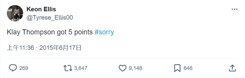 本场比赛埃利斯攻防两端暴打勇士,赛后,有球迷发现他早就看勇士“不爽”了,在2015的G6那天,他发推:“克莱今天拿了5分#sorry”