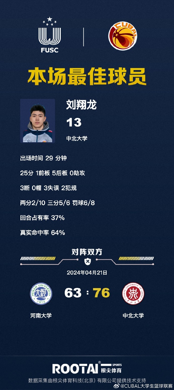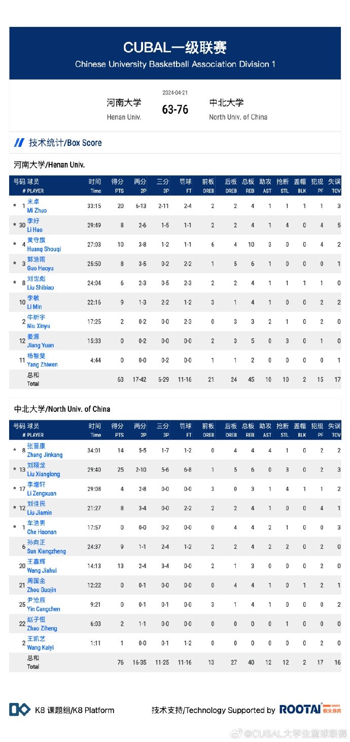 4月21日讯 CUBAL一级联赛西北赛区A组第三轮,河南大学今日对阵中北大学。