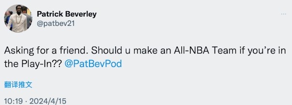 雄鹿球员贝弗利发推写道:“帮朋友问的,如果你是附加赛球队的一员,那么你还能进最佳阵容吗?”