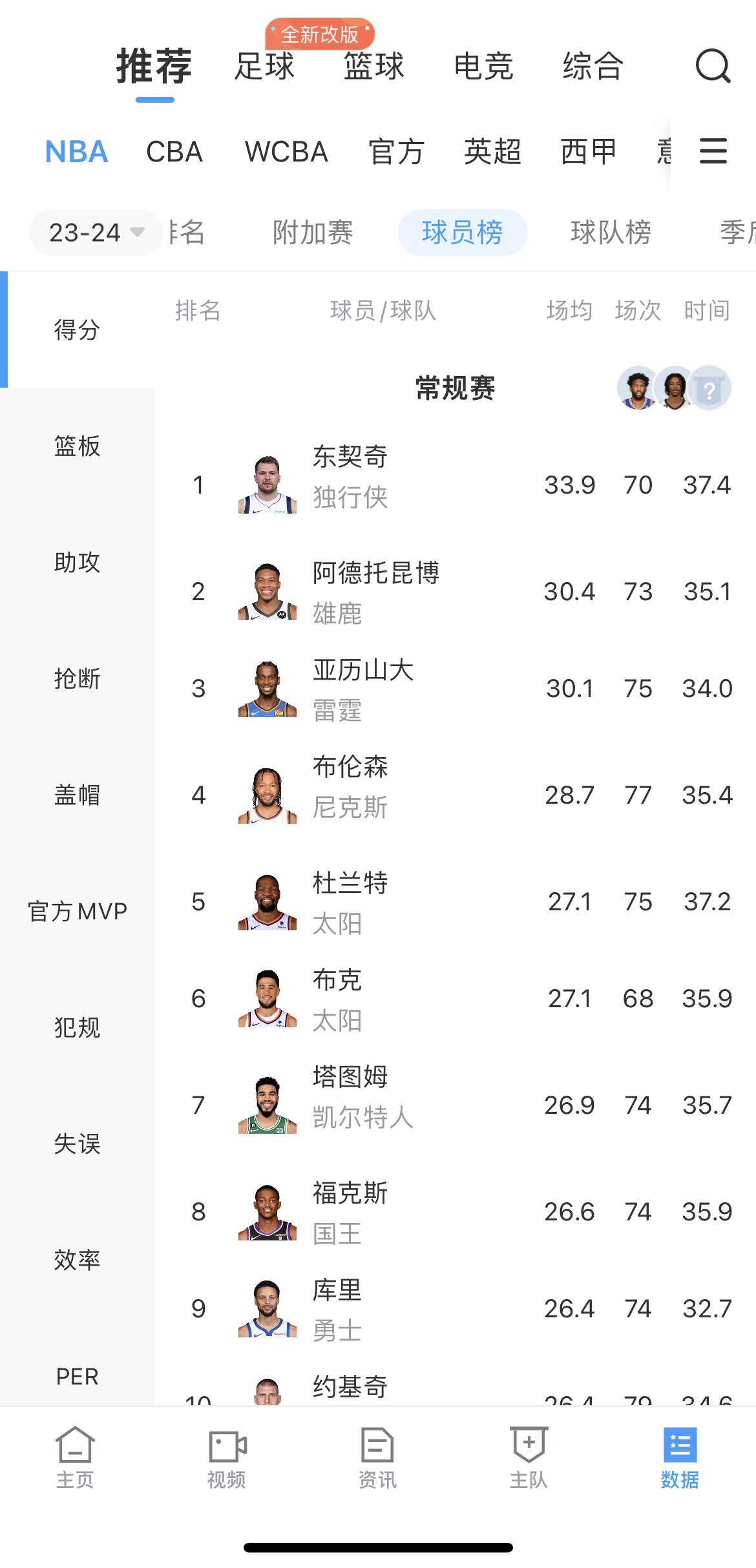 本赛季,东契奇以场均33.9分荣膺联盟得分王;字母哥和亚历山大分列二三位。