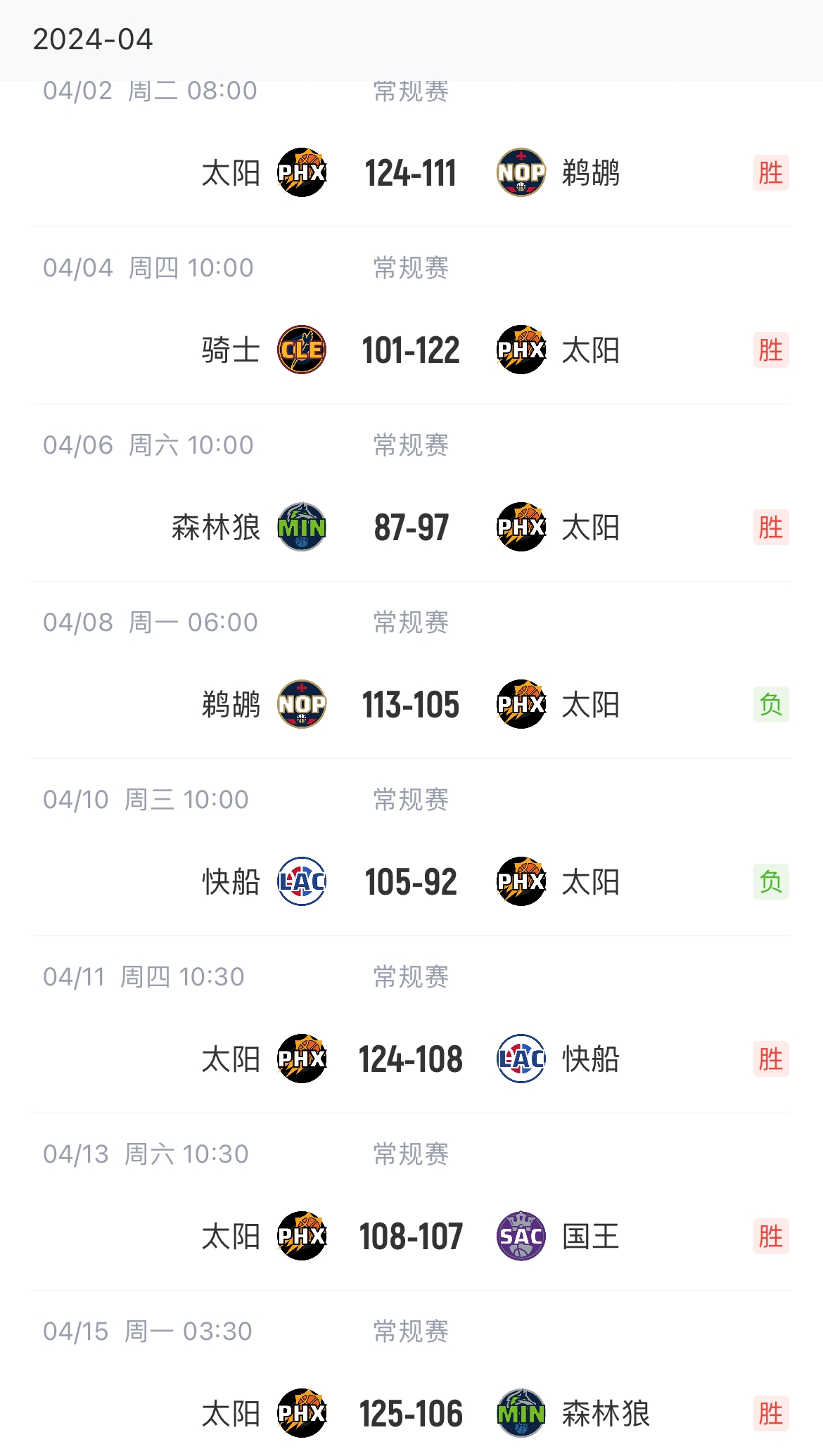 太阳4月的8场比赛赛程艰难,8个对手全部在东西部前十,胜率最低的国王也有56.1%,最后3场比赛是3连客。但他们取得了6胜2负的战绩冲进季后赛,避免了打附加赛。
