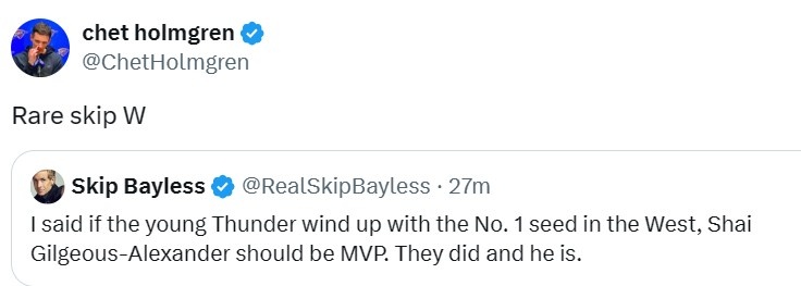 赛后,Skip评论道:“我说过,如果年轻的雷霆最终成为西部第一,那么亚历山大就应该是MVP。他们做到了,他应该是MVP。”