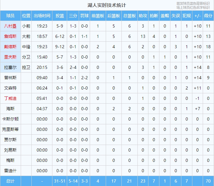 詹姆斯13分6板13助4断引领全队准6人上双 湖人半场领先鹈鹕17分