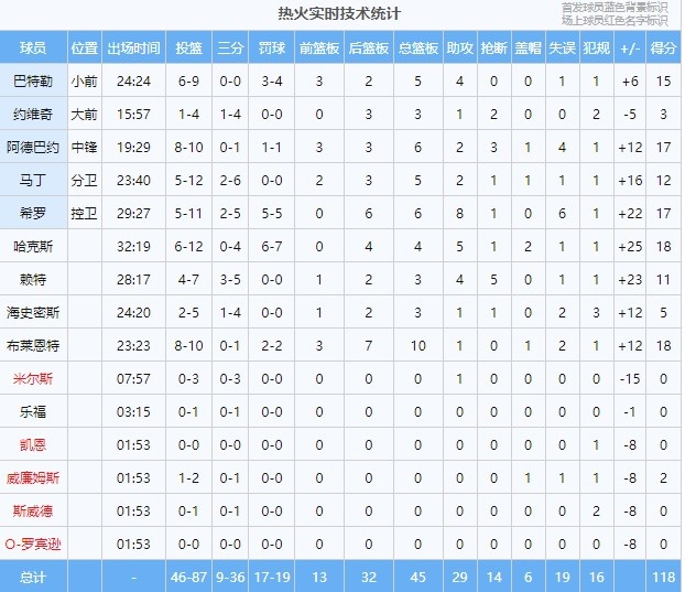 本场比赛,热火多点开花,10人有得分进账,7人得分上双,其中巴特勒15分、阿德巴约17分、马丁12分、希罗17分、哈克斯18分、赖特11分、布莱恩特18分。