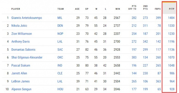 据统计,本赛季字母哥在禁区内共得到1484分,联盟高居第一,约基奇1330分排名第二,具体如下: