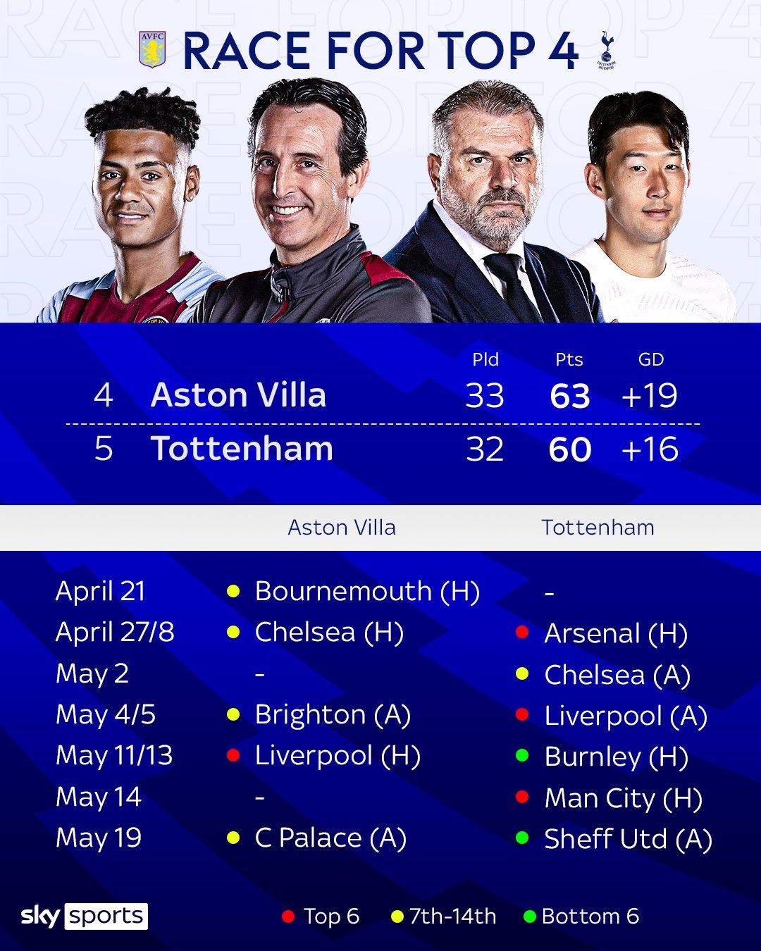 争四也激烈!维拉多赛1场领先3分,热刺还需战曼城阿森纳利物浦