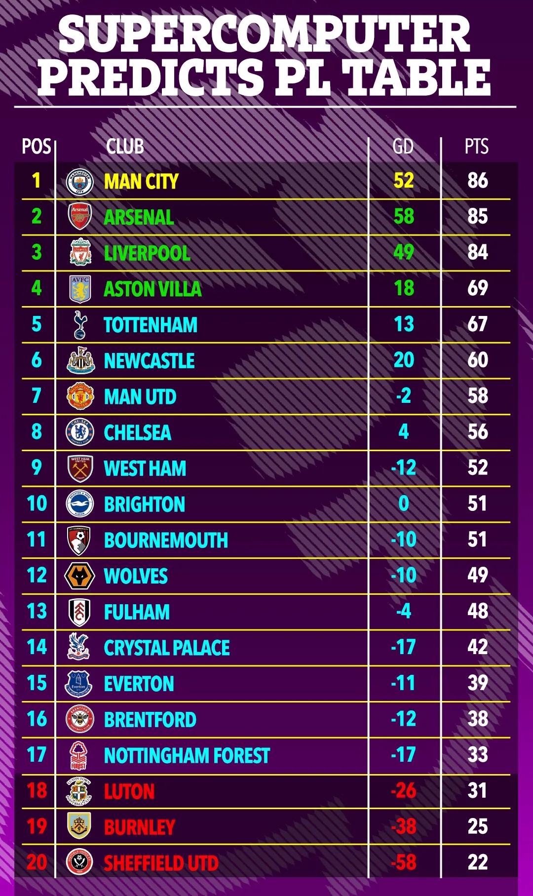 曼城将以86分夺得本赛季英超冠军,力压85分的阿森纳和84分的利物浦。阿斯顿维拉将排名第4,获得下赛季欧冠资格,热刺则将屈居第五。