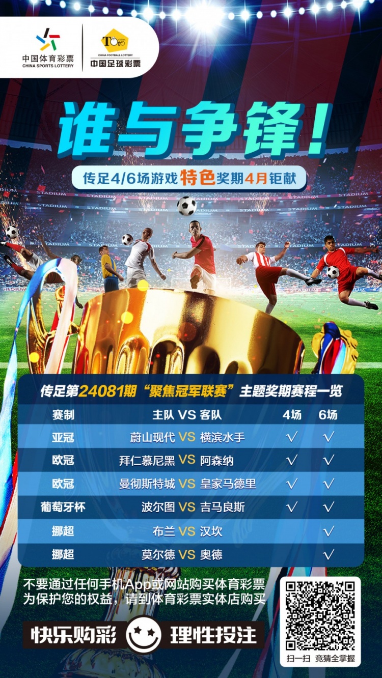 第24081期传足4/6场游戏特色奖期已经于2024年4月14日20:00开售,将于4月17日17:30停售,并于4月18日开奖,其中蔚山现代VS横滨水手、拜仁慕尼黑VS阿森纳、曼彻斯特城VS皇家马德里和波尔图VS吉马良斯为4场进球游戏竞猜赛事。