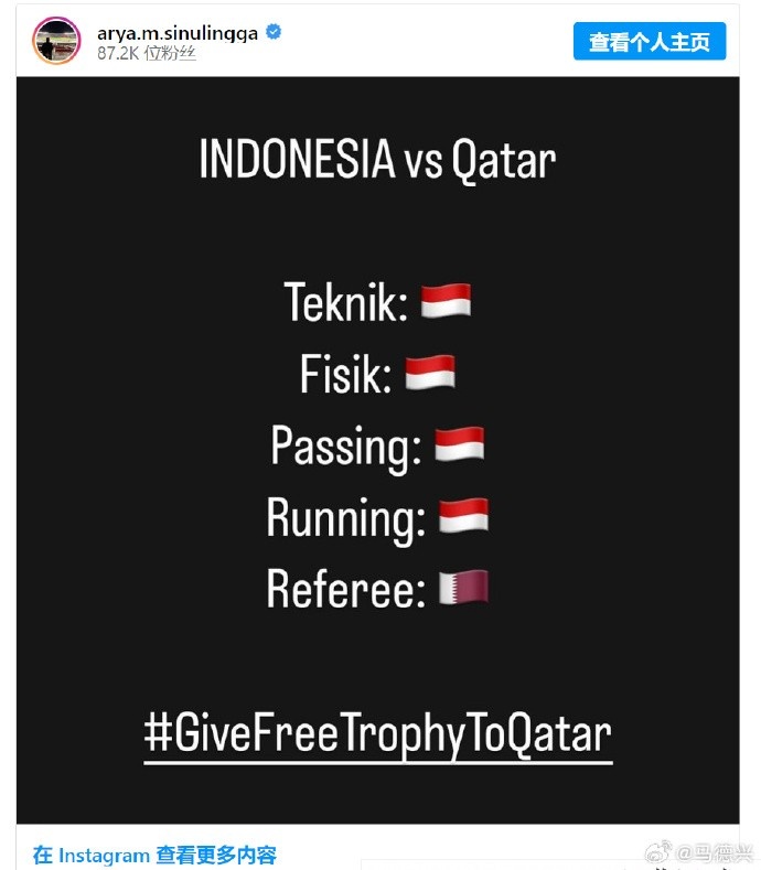 马德兴透露,印尼国奥队昨天0-2输给东道主卡塔尔之后反应强烈。印尼足协据说已经正式向亚足联提出抗议,要求取消塔吉克斯坦裁判的继续执法资格。而印尼足协一名官员通过社交媒体,更是直接呼吁:把U23亚洲杯冠军奖杯直接授予卡塔尔队。