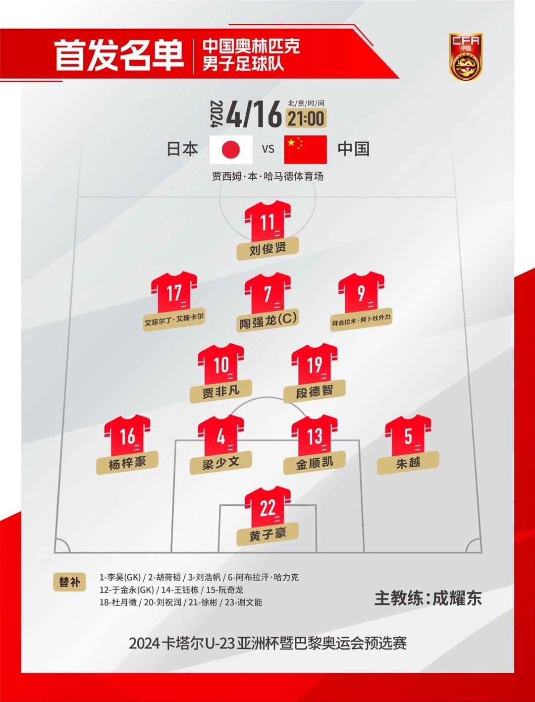 北京时间4月16日21:00,中国奥林匹克男子足球队将迎来在U23亚洲杯小组赛的第一场比赛,对手是日本队。以下为本场比赛中国队首发名单。