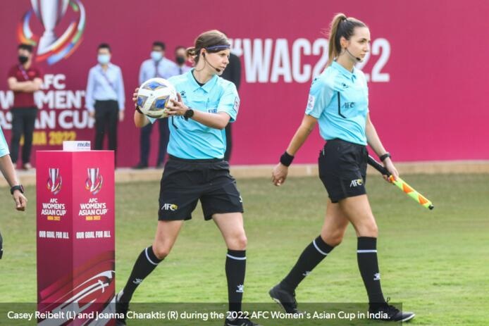 更早的时候,在2021年4月8日的东京奥运会女足亚洲区预选赛最后阶段比赛中,中国女足客场2-1击败韩国女足,当时也是由凯西担任主裁判。