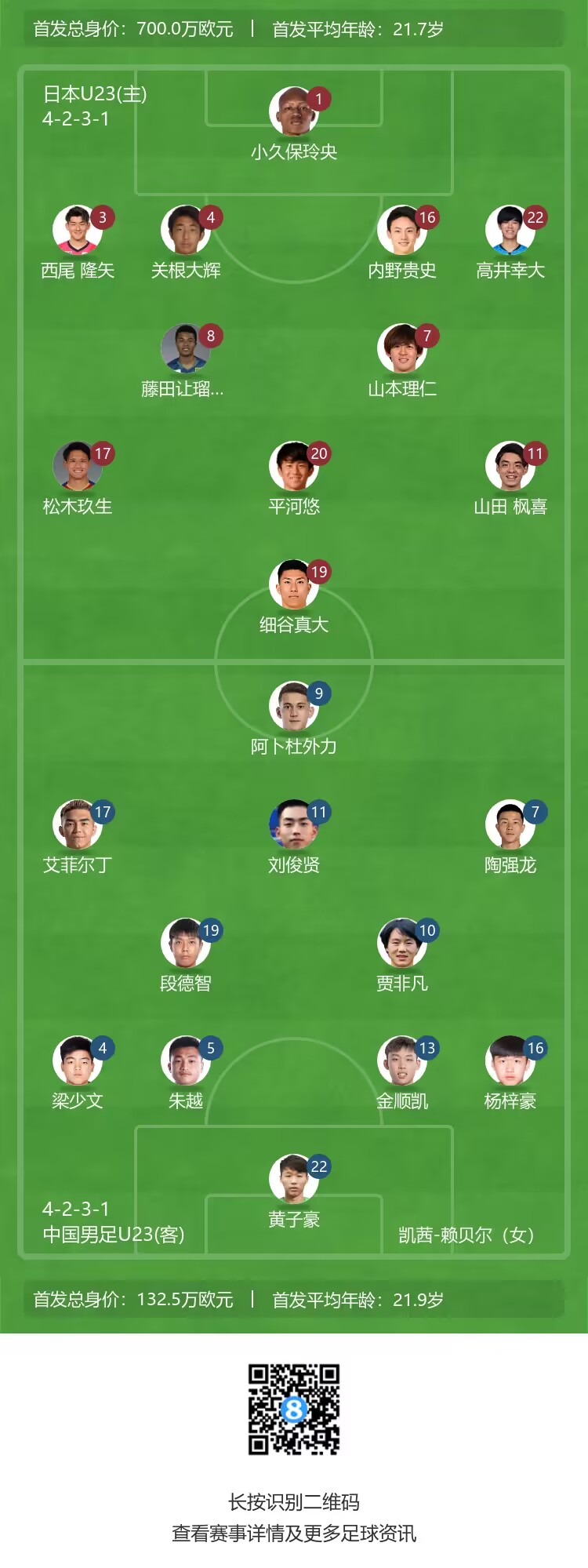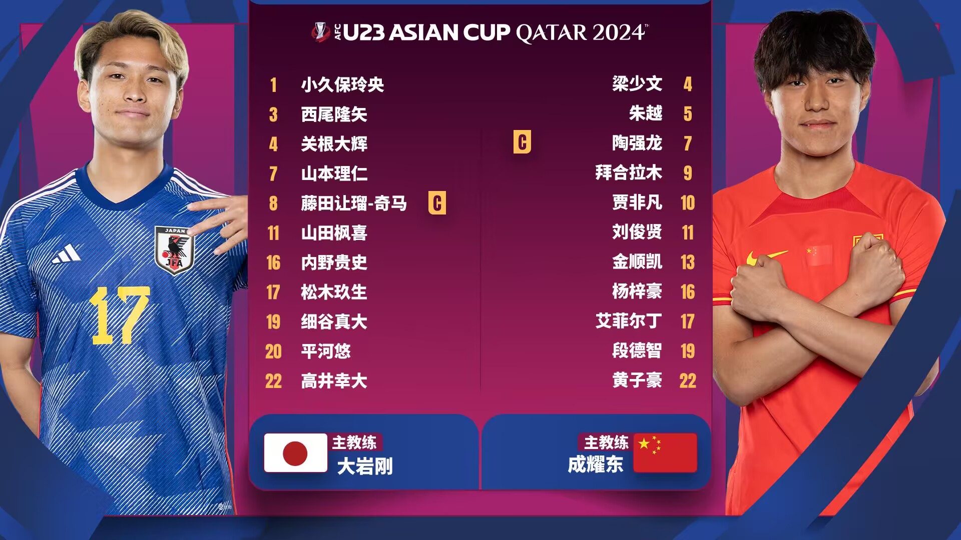 日本国奥首发:1-小久保玲央、3-西尾隆矢、4-关根大辉、16-内野贵史、22-高井幸大、7-山本理仁、8-藤田让瑠-奇马、11-山田枫喜、17-松木玖生、20-平河悠、19-细谷真大
