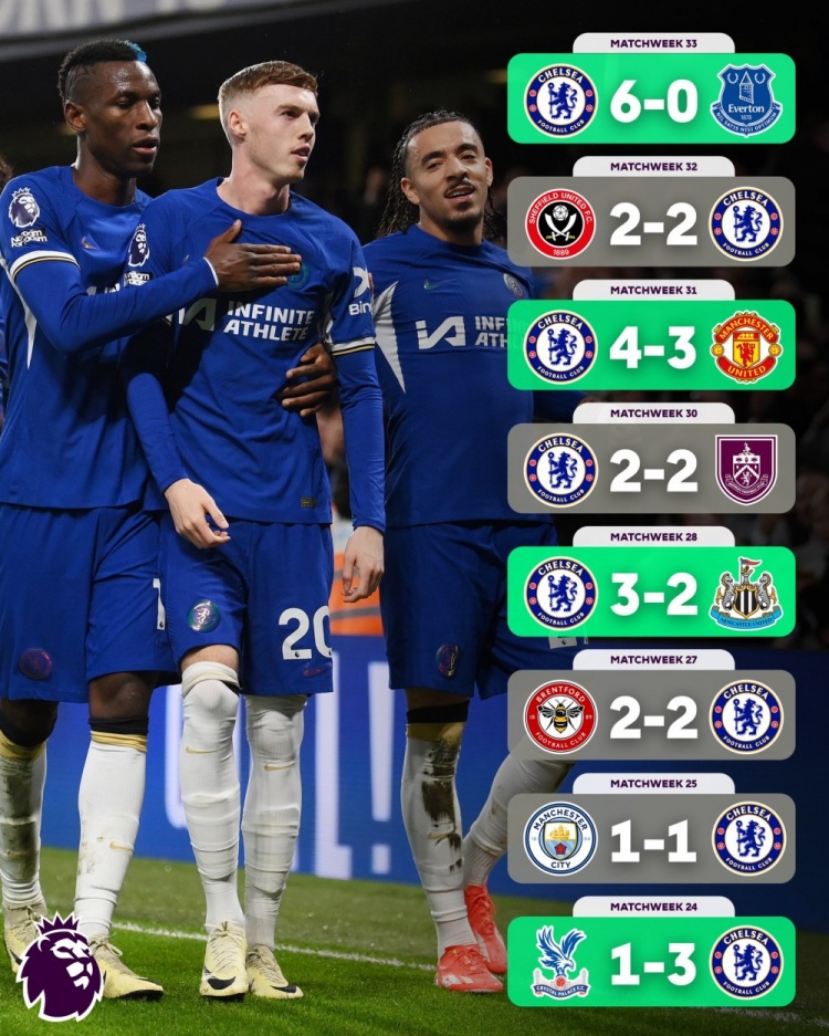 此役过后,切尔西近8场英超比赛保持不败,具体战绩4胜4平,英超官方账号在社交媒体上晒出切尔西近8场比赛的战绩,并指出蓝军上一次更长不败是在2021年3月份(10场不败)。