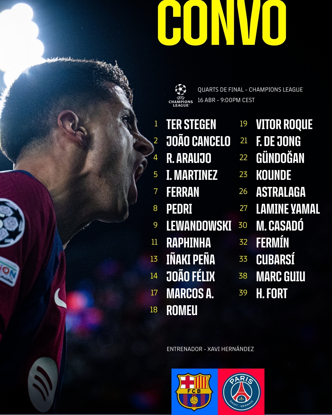 4月16日讯 巴萨欧冠战巴黎名单,佩德里、菲利克斯在列,加维、巴尔德伤缺。