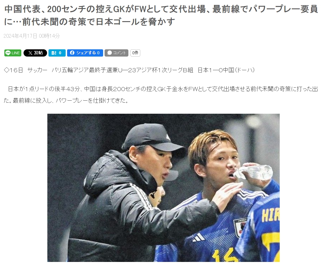 日媒写道:“下半场第43分钟,在日本队领先1分的情况下,中国队决定使用前所未见的奇策,换上身高2米的替补门将于金永投入前锋线,开始肉搏战。