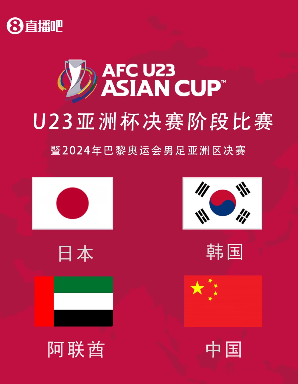 本届赛事共有16支球队参赛,获得前三名的球队将直通2024年巴黎奥运会,第四名将与非洲区的第四几内亚队进行附加赛争夺奥运会名额。本届U23亚洲杯,中国国奥与日本、韩国、阿联酋同在B组,对于分在死亡之组的中国国奥而言,每场比赛都是事关命运的生死之战。