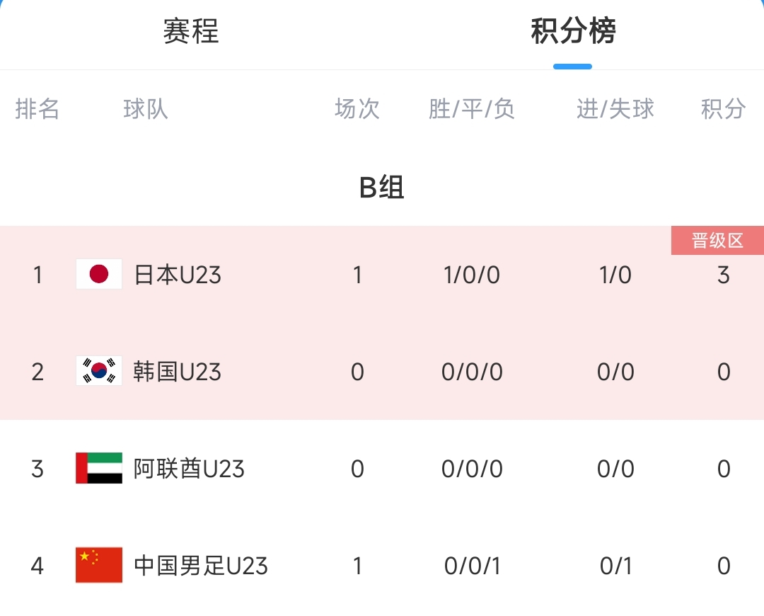 04月16日讯 U23亚洲杯小组赛B组第1轮,中国国奥0-1负于日本国奥,暂居B组第4。
