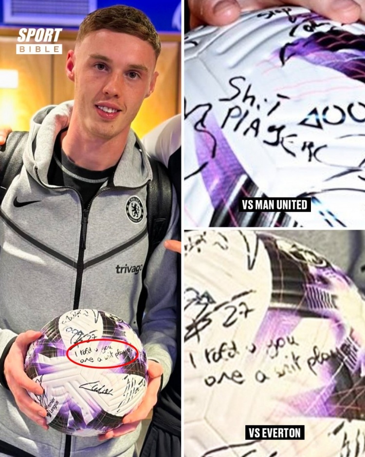 SportBible报道,之前帕尔默对曼联戴帽,赛后就有队友在他的皮球上调侃地写道“垃圾球员”(sh*t player)。而在对埃弗顿的比赛后,帕尔默的球再次被某人写上同样的调侃“都说了你是垃圾球员”(i told you, you are a sh*t player)。