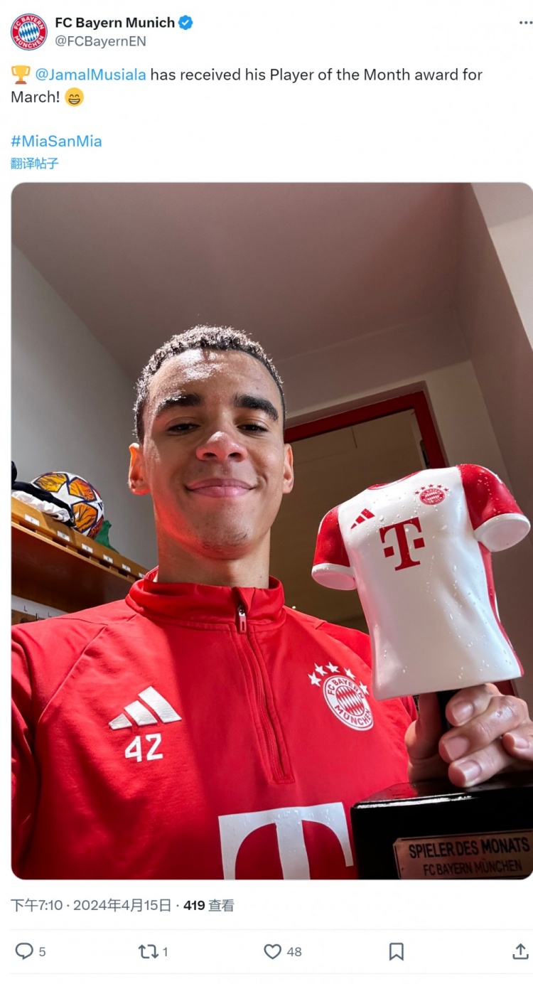 拜仁官方账号在社交媒体上晒出穆西亚拉与奖杯的合照,并写道:“穆西亚拉领取了3月最佳球员奖杯。”