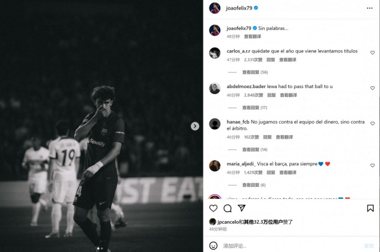 本场比赛阿劳霍被红牌罚下成为比赛转折点,下半场主帅哈维被罚下,球队还送给对手一粒点球。赛后菲利克斯社媒晒出一张捂着嘴的照片,配文:“无话可说。”