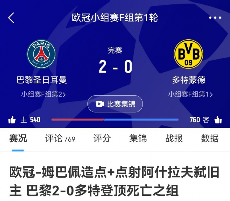 两支球队均来自本赛季的死亡之组!小组赛双方两度交手,第1轮巴黎在主场2-0击败多特,第6轮双方在多特主场1-1战平。
