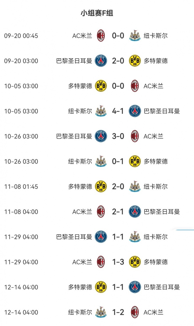 小组赛末轮,死亡之组的四支球队全都保留着晋级希望!最终,多特和巴黎携手出线,AC米兰进入欧联附加赛,纽卡小组垫底淘汰。