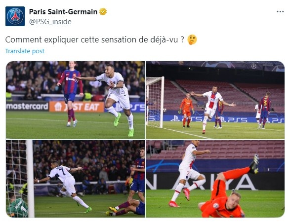 赛后,巴黎官推晒出多张姆巴佩攻破巴萨球门后的庆祝照,并写道:“这种似曾相识的感觉,怎么说呢?