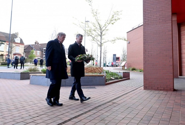今天上午,利物浦俱乐部首席执行官比利-霍根和肯尼-达格利什爵士,以及俱乐部男队和女队的主教练和队长分别向安菲尔德的希尔斯堡纪念碑敬献了花圈。