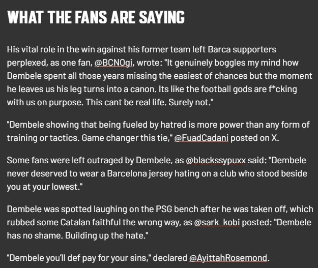 4月17日讯 欧冠1/4决赛次回合,巴黎客场4-1战胜巴萨,总比分6-4逆转晋级四强。登贝莱面对旧主贡献进球+造点,当选本场最佳球员,他还用微笑和鼓掌回应了巴萨球迷的嘘声。赛后一些国外巴萨球迷将“火力”对准了这名旧将。