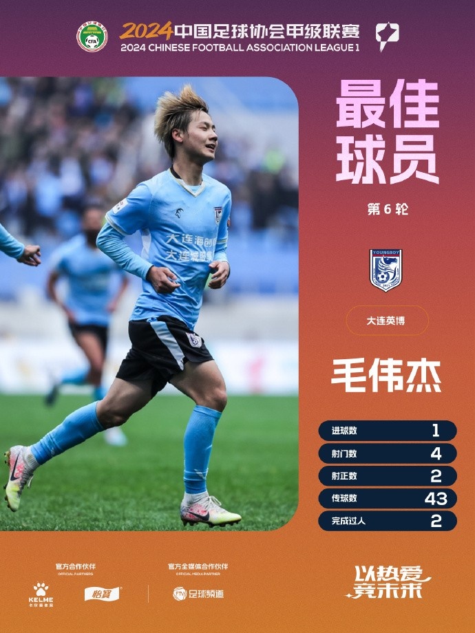 4月17日讯 中甲联赛官方公布,大连英博球员毛伟杰当选中甲第6轮最佳球员。