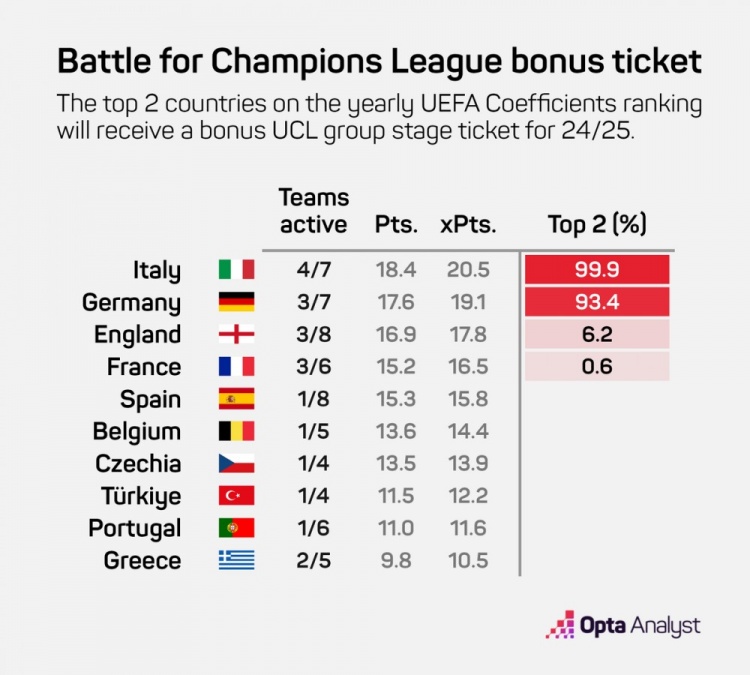 随着阿森纳、曼城在欧冠1/4决赛出局,本赛季英超仅剩利物浦、西汉姆和维拉仍在参加欧战,Opta计算出了各国联赛获得额外欧冠席位的概率,英超仅剩6.2%。