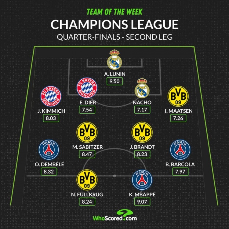 4月18日讯 WhoScored评选出了欧冠1/4决赛次回合比赛的最佳阵容,多特有四名球员入选。