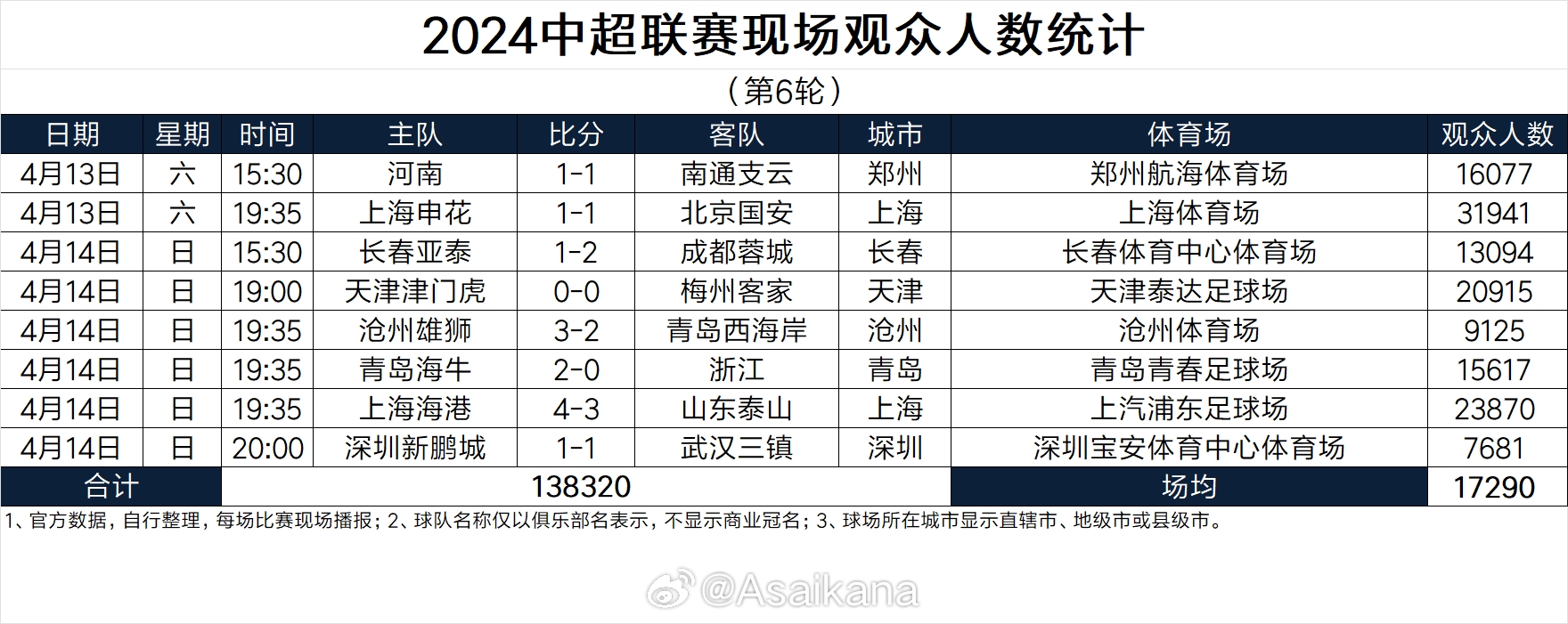 中超第6轮现场观众数:场均17290人,京沪德比31941人最多