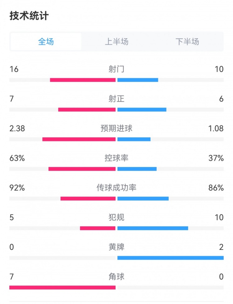 4月15日讯 本轮意甲国米2-2战平卡利亚里,双方全场重点数据对比如下↓