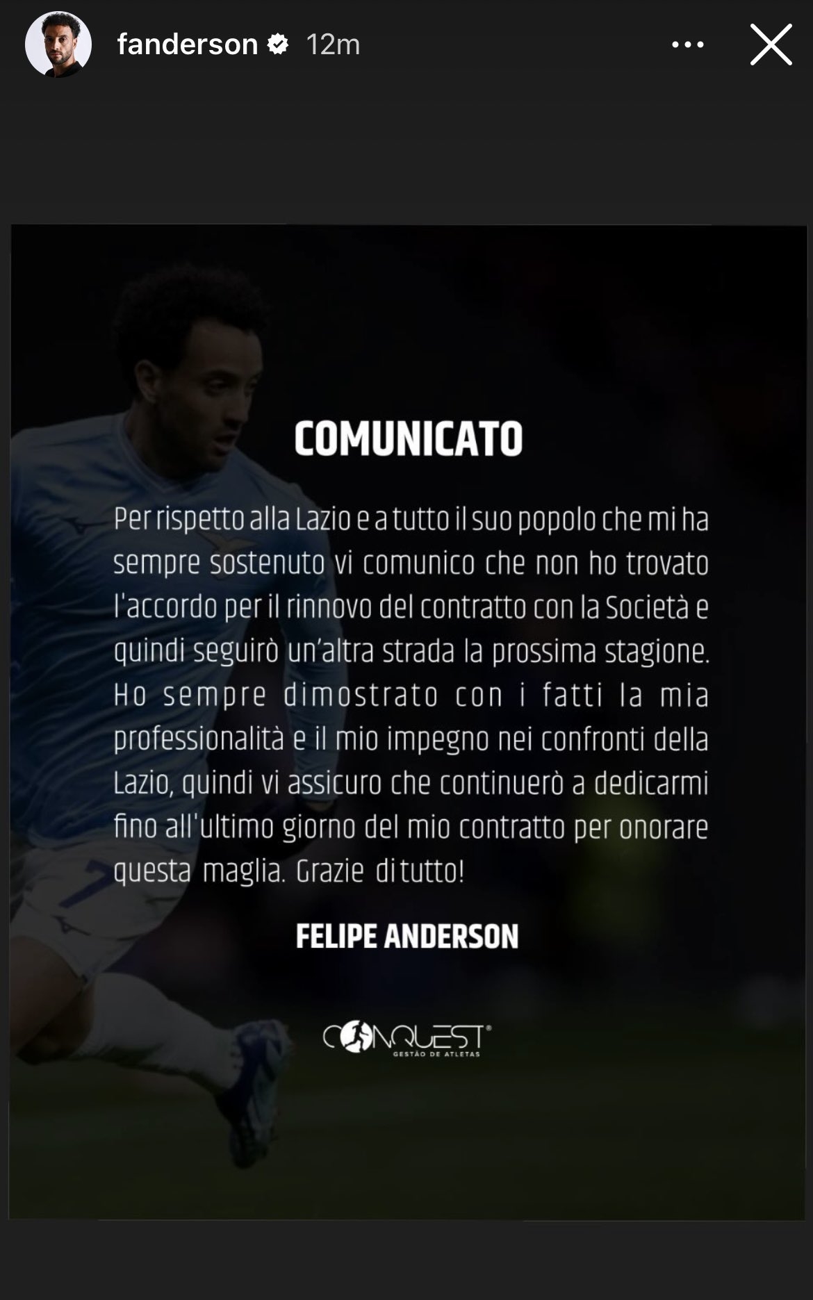 4月16日讯 不久前,拉齐奥边锋费利佩-安德森发文宣布将在本赛结束后离开拉齐奥。