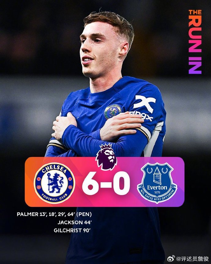 04月16日讯 英超第33轮切尔西主场6-0埃弗顿,詹俊发文点评了本场比赛。