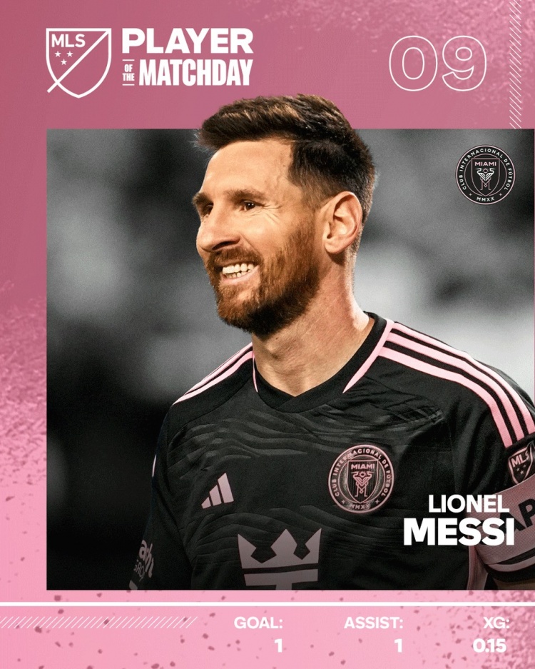在美职联第9轮比赛中,梅西传射建功,帮助迈阿密国际客场3-2击败堪萨斯城,美职联官方确认他当选本轮最佳球员。