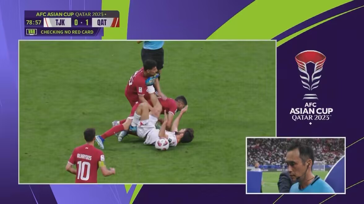 1月18日讯 卡塔尔vs塔吉克斯坦比赛第80分钟,卡莫洛夫蹬踏对方下巴暴力犯规。裁判在观看VAR后,直接将他红牌罚下。