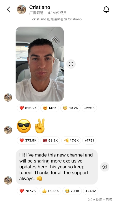 04月16日讯 C罗今日ins创建了新频道,发布一张自拍照,同时C罗表示将在频道中分享更多独家更新的信息。感谢大家一直以来的支持。